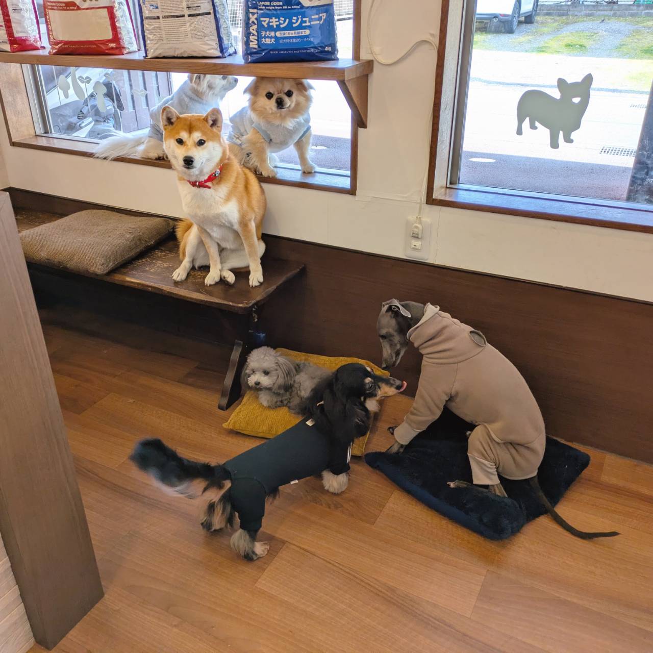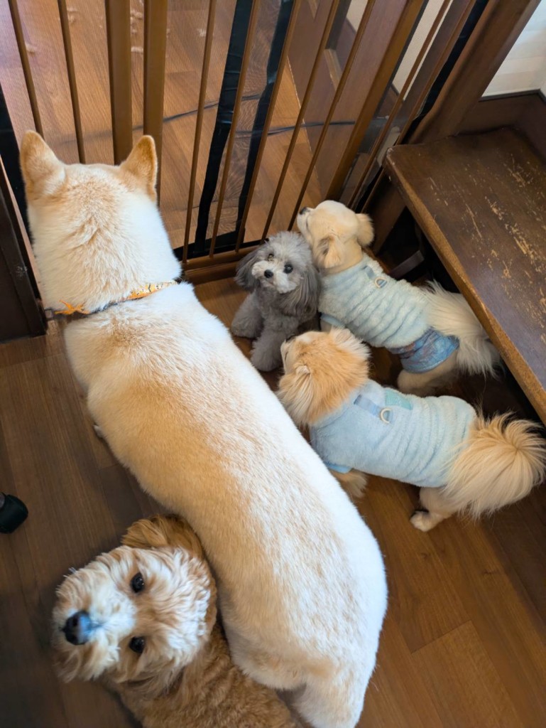 柴犬の陸くんと大也くんとさくらちゃんと小鞠ちゃんです。