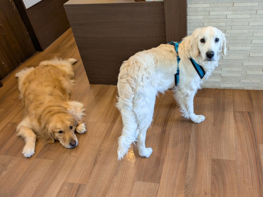 ゴールデンのつむぎちゃんとキースくんです。